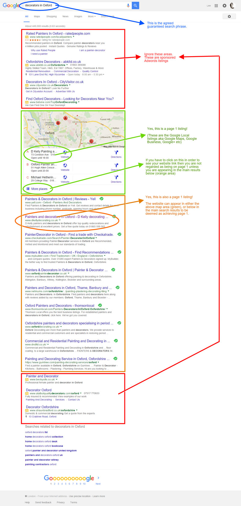 Google changes how it displays results periodically. If your website appears on the first page of results at Google.co.uk in either the local map area (known as either Google+, Google Local, Google Places, Google Business etc) or the main organic listings, then it is deemed to have achieved a page 1 result.